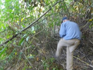 背丈よりも高い棘がある下草が多い茂った斜面を草を刈りながら前進する