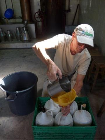 We were expecting bit of a wait – and we got it! Not as bad as olive oil pressing time, but a 10am appointment saw us start the distillation closer to 1pm. Still the process is quite quick, and within the hour there was a large, well-used black plastic bucket full of our bagaço. Almost 25 litres of 63 vol% alcohol!