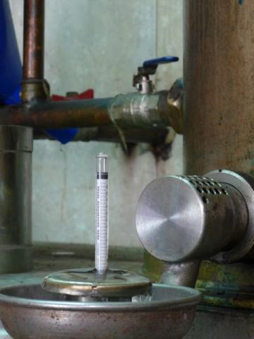 The process uses steam – it's piped in to the bottom of the column and as the mash gradually warms up the alcohol evaporates off first. It condenses down through the narrower of the two copper columns, from where it runs out into a collecting vessel.