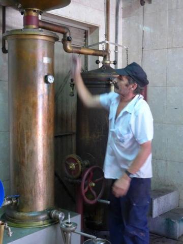 The operator keeps a careful eye on the alcohol reading as given by a special hydrometer. Toward the end, as the alcohol content of the runoff goes down, he carefully compares it with the bagaço in the large bucket – mixing in a little more, then a little more, until the final reading is about 63 vol% (actually, 23° on the ancient Cartier scale that they still use here). That's the strength that the Portuguese seem to prefer!