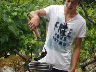 写真は庭の屋根の下でくつろぐ友人たちと、チョリソを焼く村の少年。